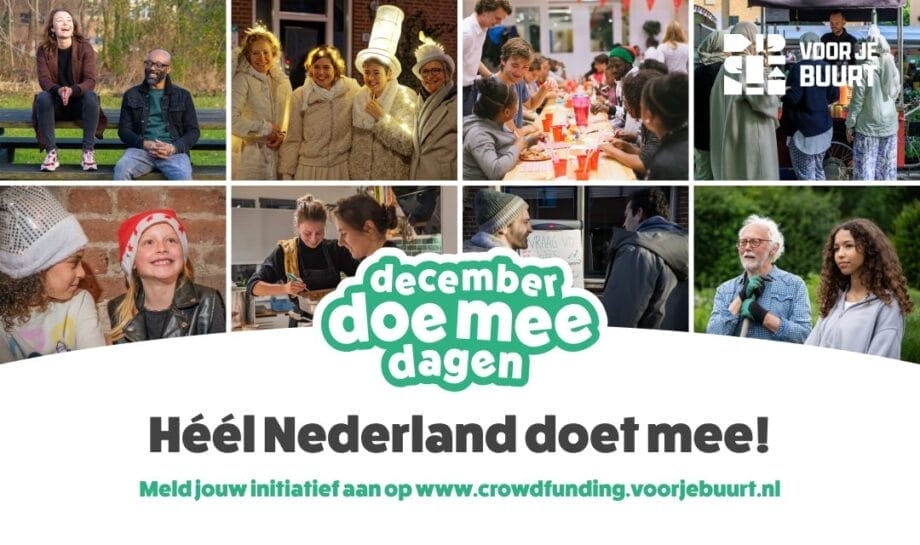 De December Doe mee Dagen biedt je de kans om jouw idee écht van de grond te krijgen met steun uit jouw eigen gemeenschap én onze matchfunding-partners. Samen maken we deze december een maand om nooit te vergeten, vol impact en verbondenheid.